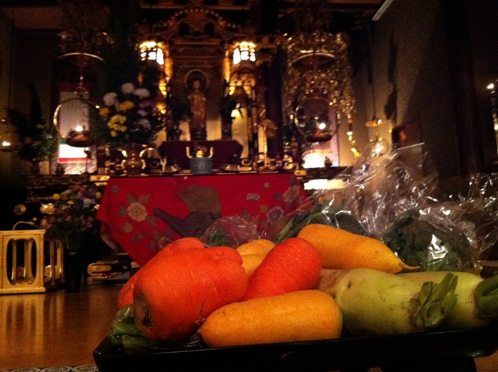 仏様の前に置かれたやさいを見て、それをつくった生産者の顔が浮かびました。