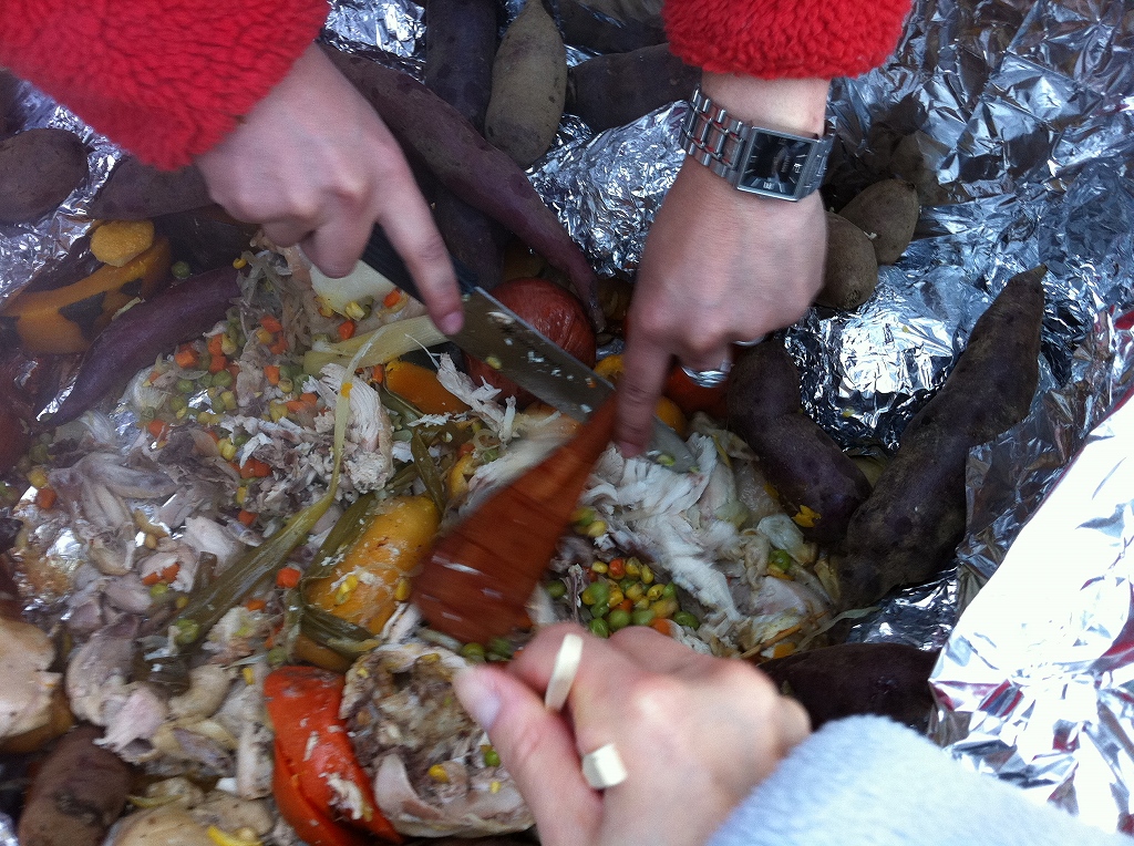 アウトドアショップやメーカーさんも協力して約5時間かけつくられた鶏ややさい